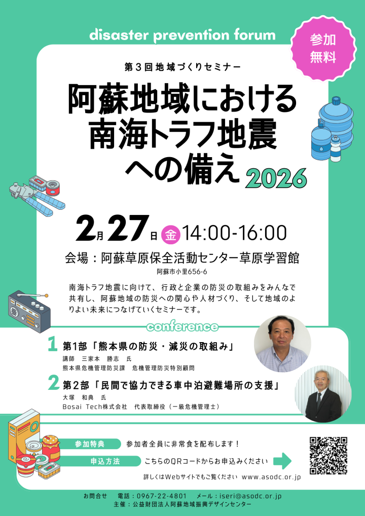 いつ起きてもおかしくないと言われる「南海トラフ地震」。阿蘇地域において、私たちはどのような備えをしておくべきでしょうか。当財団では、行政と民間、それぞれの視点から防災・減災を考えるセミナーを開催します。今回は「熊本県の最新の対策」に加え、近年注目されている「車中泊避難場所の支援」について、専門家を招いて具体的に学びます。防災は、地域づくりの基礎となる重要なテーマです。行政・企業・住民が連携し、災害に強い阿蘇を作るために、ぜひ知見を共有しましょう。参加費は無料、定員は先着50名となっております。当日は参加特典として、全員に「非常食」のプレゼントもご用意しております。皆さまのお申込みをお待ちしております。イベント詳細開催日時令和8年2月27日(金)14:00~16:00会場阿蘇草原保全活動センター「草原学習館」(阿蘇市小里656-6)講師・テーマ【行政の視点】三家本 勝志氏(熊本県危機管理防災特別顧問)テーマ:「熊本県の防災・減災対策の取組み」【民間の視点】大塚 和典氏(Bosai Tech株式会社代表取締役/一級危機管理士)テーマ:「民間で協力できる車中泊避難場所の支援」対象:どなたでもご参加いただけます。お申込み・定員定員:50名(先着順となりますのでお早めにお申し込みください)申込方法下記URLまたはチラシのQRコードよりご登録ください。https://forms.gle/ZMnWNwgM8EZspy1K6